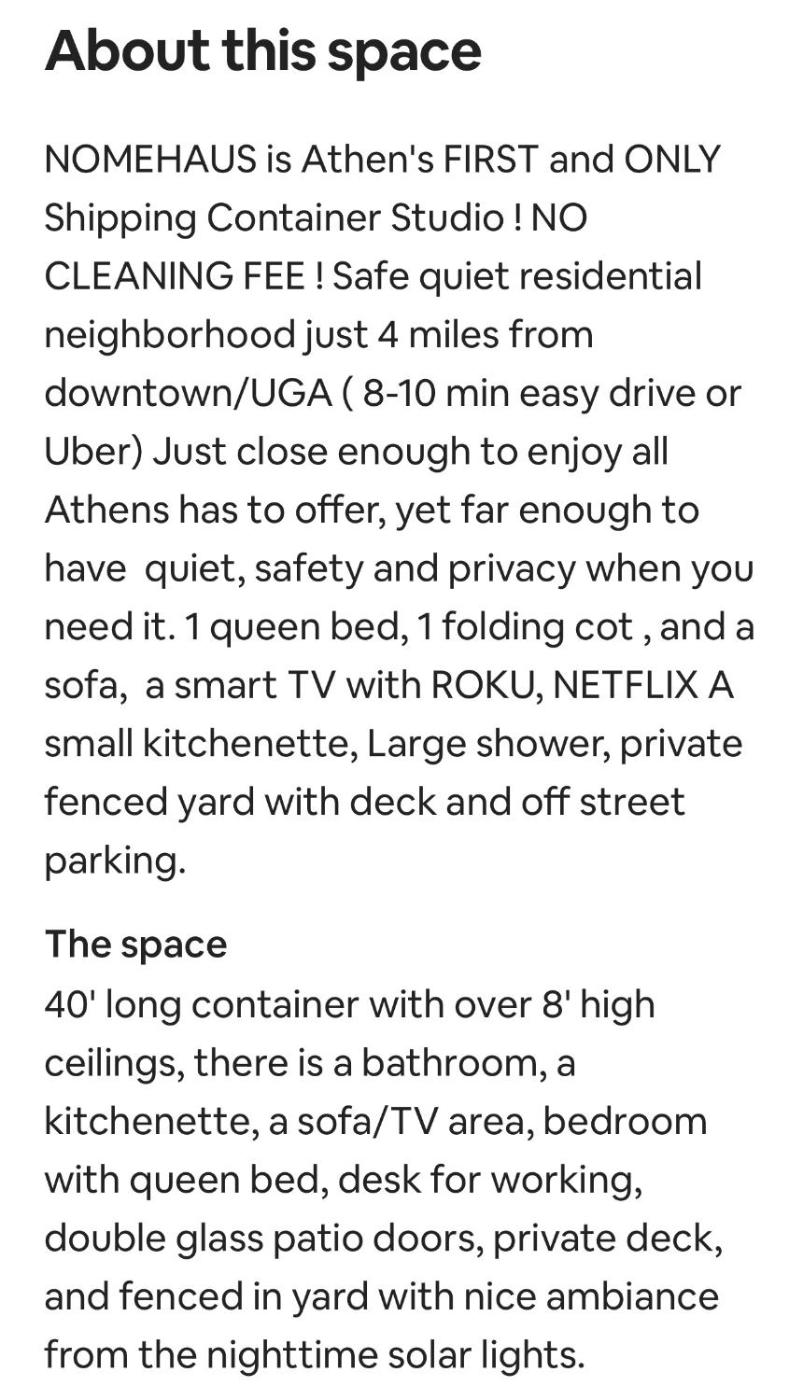 Obiekt Nomehaus shipping container studio residential neighborhood ATHENS oferuje zakwaterowanie w pokojach usytuowanych w miejscowości Athens. Odległość ważnych miejsc od obiektu: State Botanical Garden of Georgia – 8,9 km, University of Georgia Performing Art Center – 10 km. W okolicy znajdują się ciekawe miejsca takie jak: Athens Arena ( 4,6 km), Stadion Sanford Stadium ( 5,5 km), The Georgia Theatre ( 7,2 km). Na miejscu dostępny jest taras oraz bezpłatny prywatny parking. Goście mogą też korzystać z bezpłatnego WiFi.