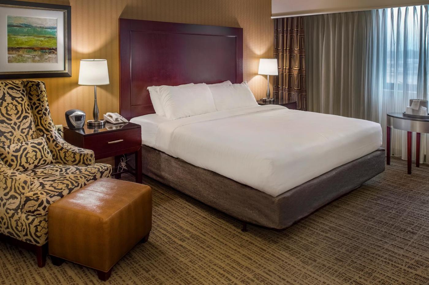 King Room - Non-Smoking. This room features a 47-inch flat-screen TV, a work desk and a wing back chair with an ottoman. ;