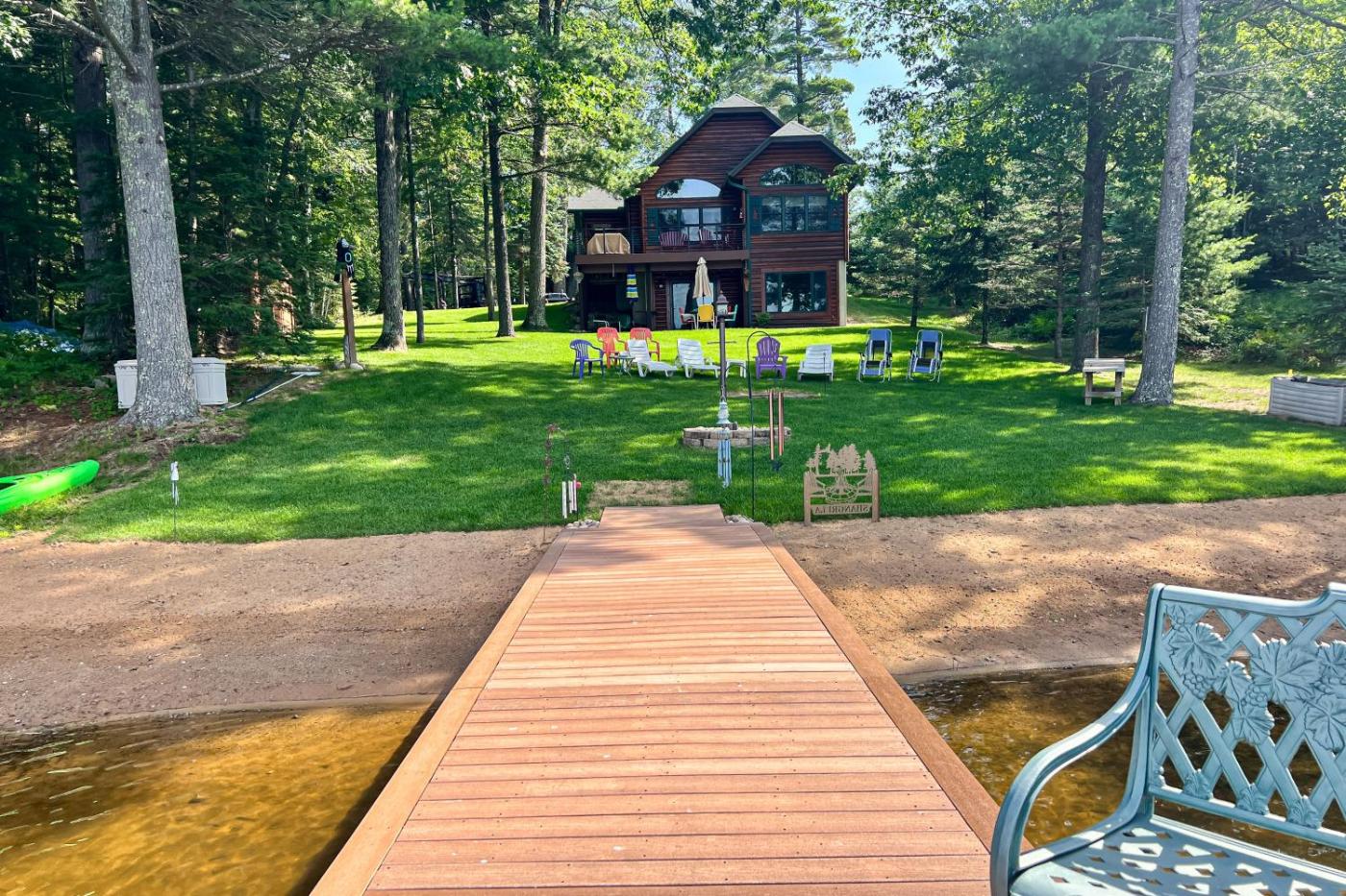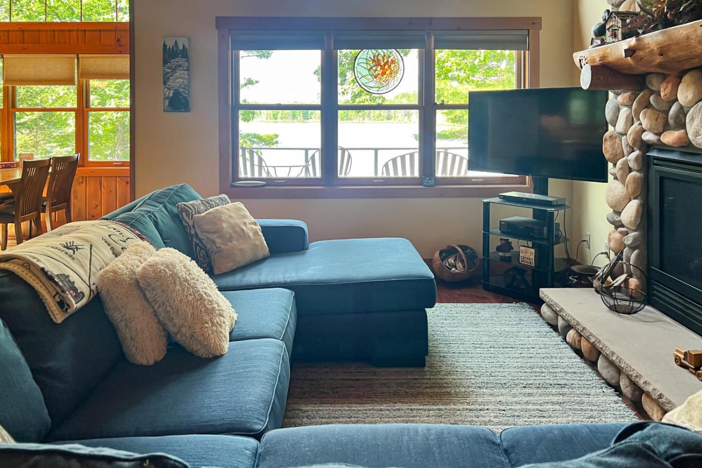 The spacious holiday home comes with 3 bedrooms, 2 bathrooms, bed linen, towels, a flat-screen TV with streaming services, a dining area, a fully equipped kitchen, and a patio with lake views. There is also a seating area and a fireplace.