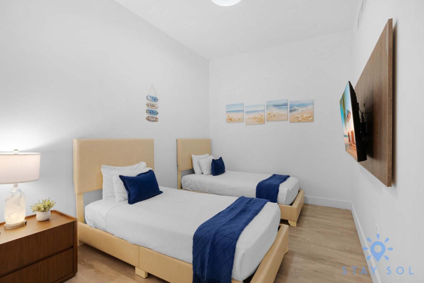 W apartamencie z 2 sypialniami zapewniono salon z telewizorem z dostępem do kanałów kablowych, kuchnię z pełnym wyposażeniem, w tym lodówką i zmywarką, a także łazienkę (1) z wanną z hydromasażem. W apartamencie zapewniono ręczniki i pościel.