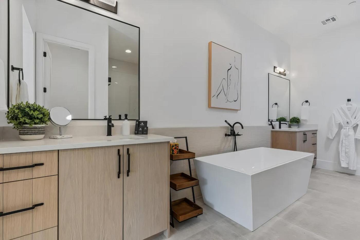 Six-Bedroom House. This luxurious holiday home provides a private pool, a hot tub and a fireplace. Boasting a private entrance, this spacious holiday home also includes 6 bedrooms, a seating area and 7 bathrooms with a shower and a hairdryer. Guests will find a stovetop, a refrigerator, a dishwasher and kitchenware in the fully equipped kitchen. The holiday home also features a barbecue. The air-conditioned holiday home offers a flat-screen TV, a washing machine, a tea and coffee maker, a dining area as well as garden views. The unit has 9 beds.