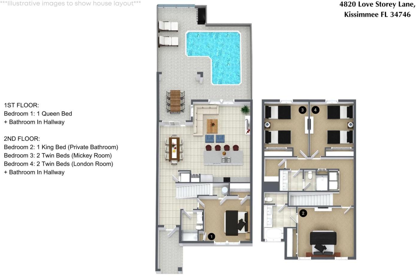 Oferta obiektu 4 Bedrooms 3 Bathrooms Storey Lake 4820 Ls położonego w miejscowości Kissimmee obejmuje prywatny basen oraz bezpłatne Wi-Fi. Odległość ważnych miejsc od domu wakacyjnego: Disney Springs – 8,9 km, Kompleks sportowy Disneys Wide World of Sports – 10 km.