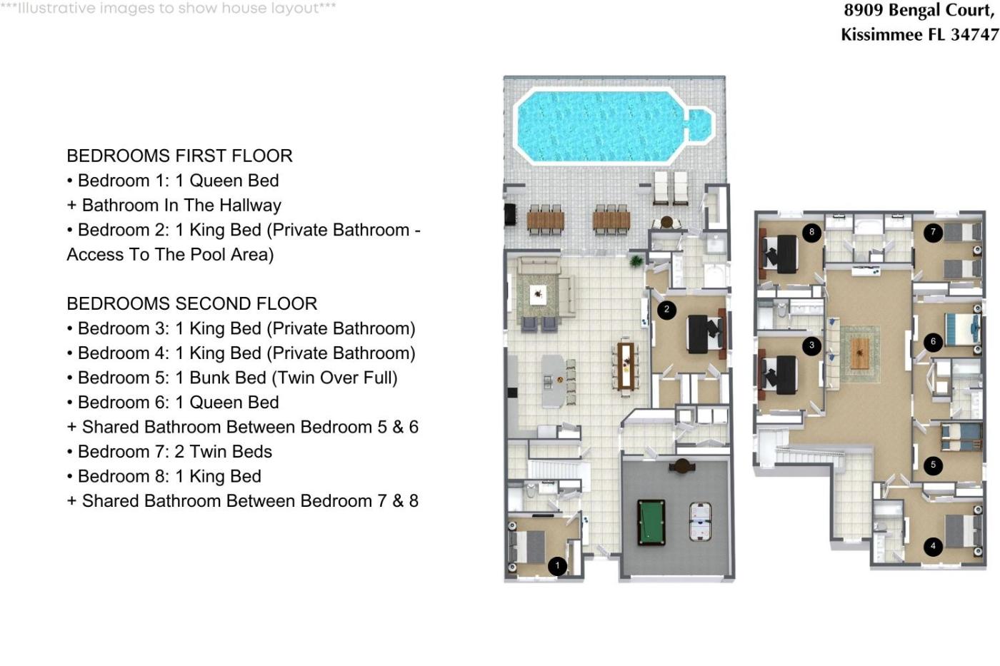 Obiekt 8 Bedrooms 6 Bathrooms Westside 8909 Bc położony jest w miejscowości Kissimmee i oferuje bezpłatne Wi-Fi oraz klimatyzację. Odległość ważnych miejsc od obiektu: Kompleks sportowy Disneys Wide World of Sports – 17 km, Disneys Animal Kingdom – 17 km. Oferta domu wakacyjnego obejmuje prywatny basen.