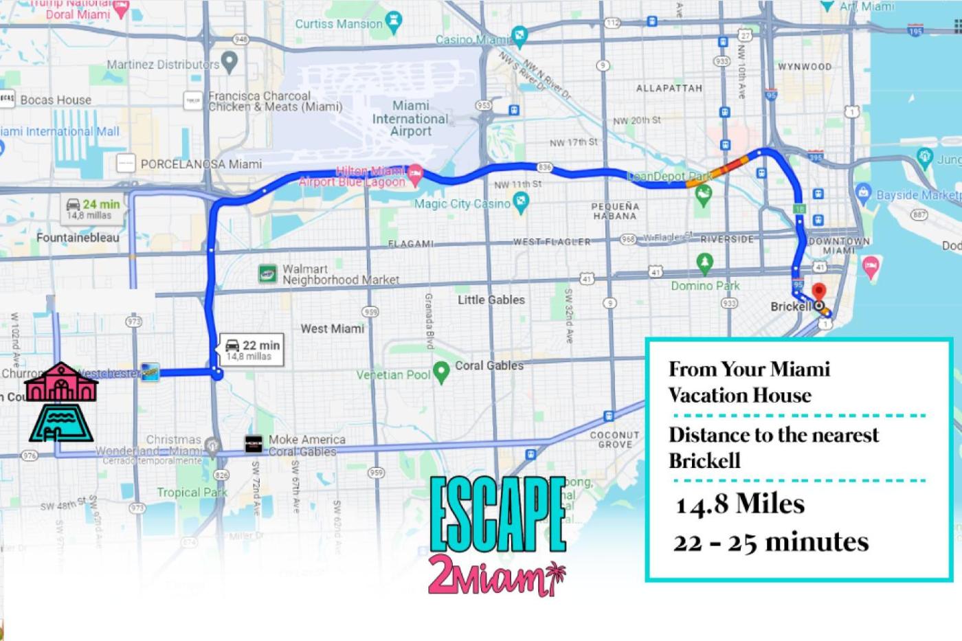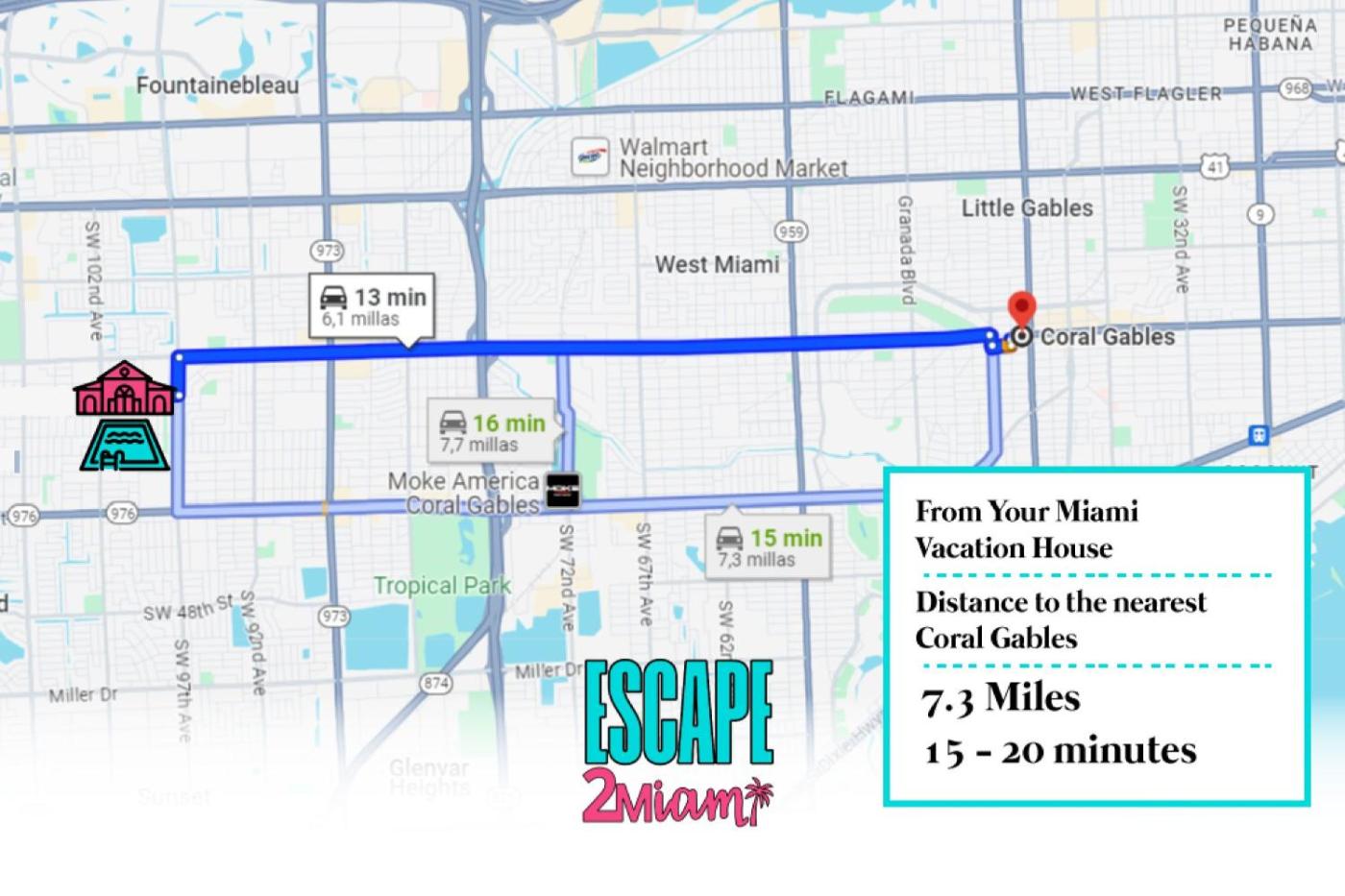 Odległość ważnych miejsc od obiektu: Uniwersytet w Miami – 12 km, Centrum handlowe Cocowalk – 13 km. Lotnisko Lotnisko Miami znajduje się 9 km od obiektu.