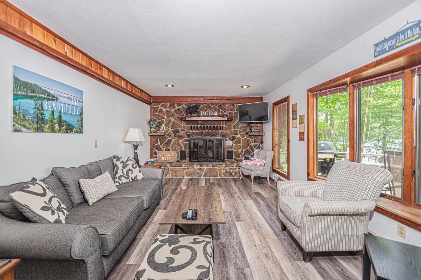 Three-Bedroom House. This holiday homes special feature is the fireplace. Featuring a private entrance, this holiday home comprises 3 bedrooms, 2 bathrooms and a kitchen. Guests will find a stovetop, a refrigerator, a dishwasher and kitchenware in the kitchen. The holiday home also provides guests with a barbecue. The spacious holiday home provides a washing machine, a tea and coffee maker, tumble dryer, a TV with cable channels, as well as lake views. The unit offers 4 beds.