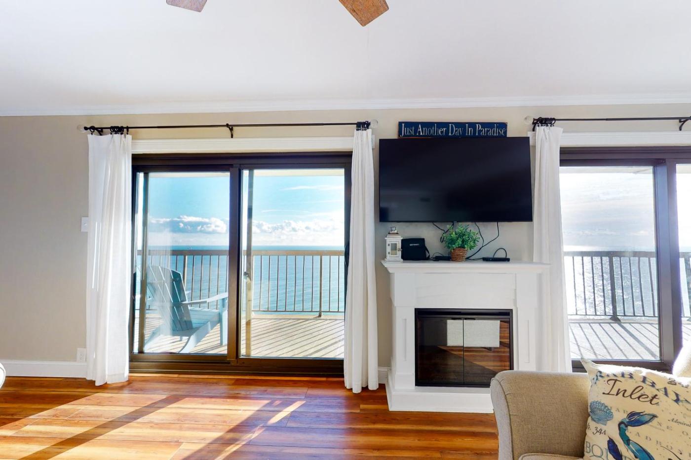 Three-Bedroom Apartment. The fireplace is a top feature of this apartment. Boasting a private entrance, this air-conditioned apartment comes with 1 living room, 3 separate bedrooms and 2 bathrooms with a walk-in shower and a bath. Meals can be prepared in the kitchen, which features a stovetop, a refrigerator, a dishwasher and kitchenware. The spacious apartment features a washing machine, a tea and coffee maker, a seating area, a TV with streaming services, as well as sea views. The unit has 7 beds.