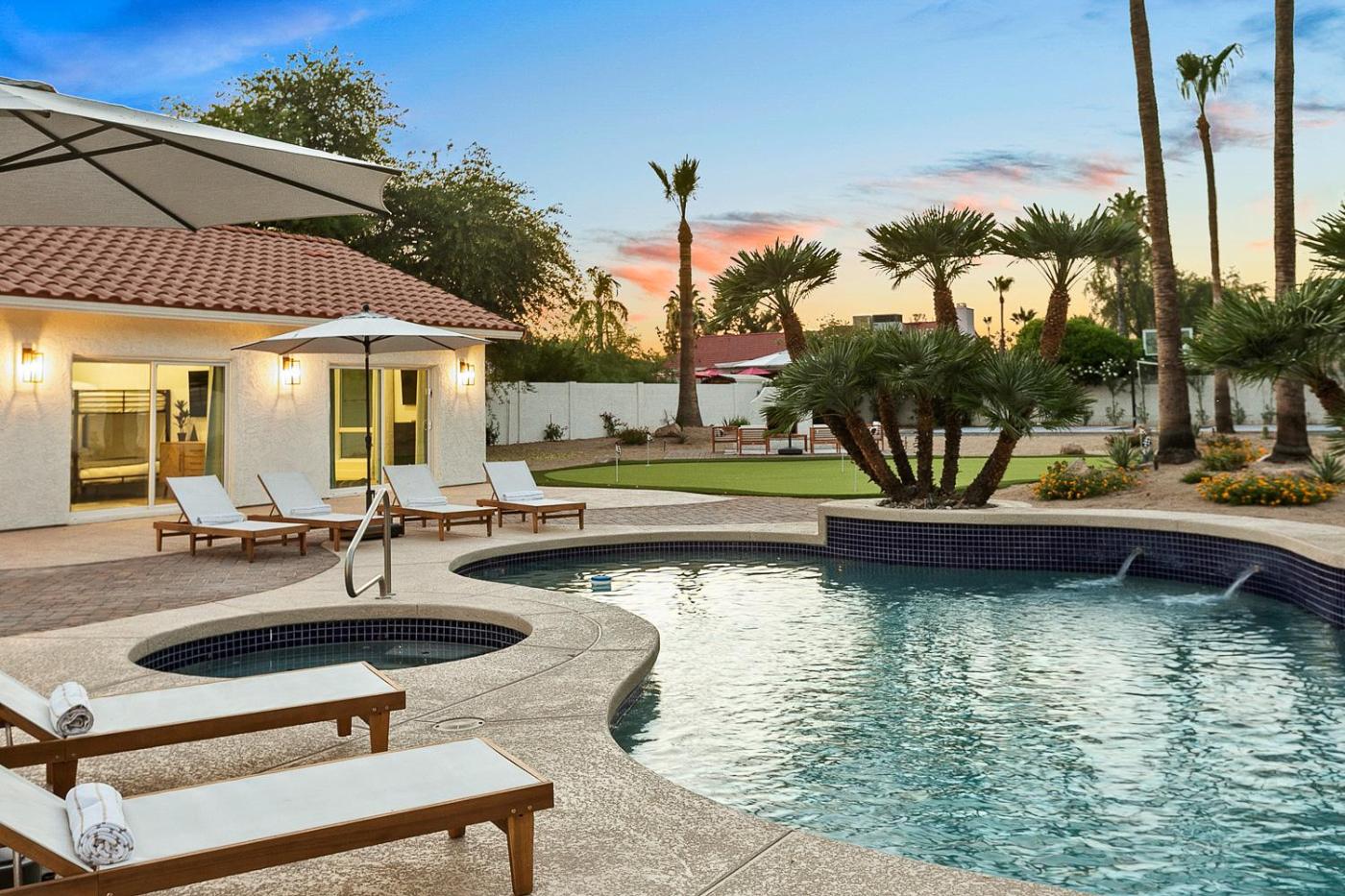 Obiekt Palms Away położony jest w miejscowości Phoenix i oferuje klimatyzację. Odległość ważnych miejsc od obiektu: Centrum kongresowe Phoenix Convention Center – 27 km, Plac Copper – 28 km. Obiekt zapewnia prywatny basen, bezpłatne Wi-Fi oraz bezpłatny prywatny parking.